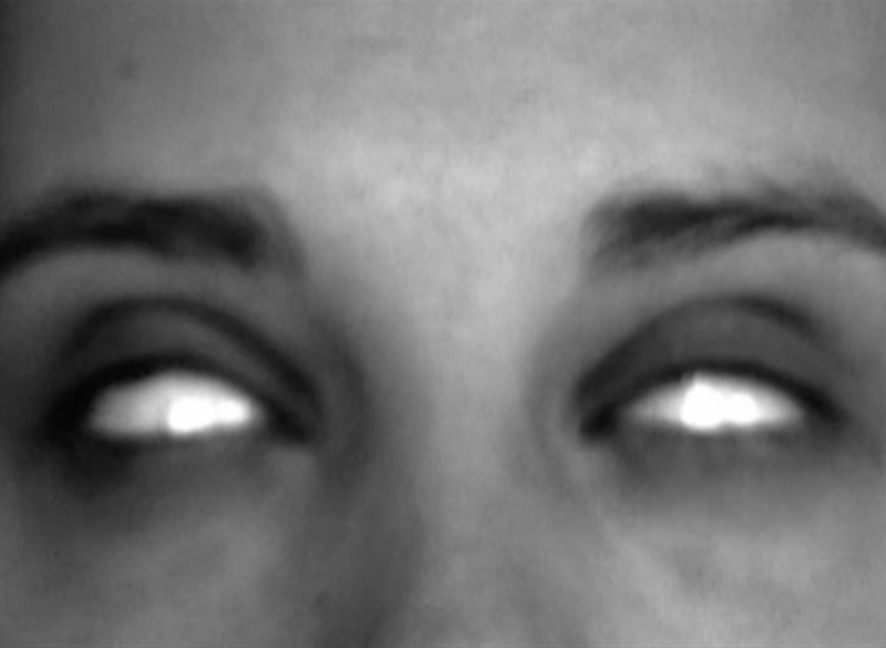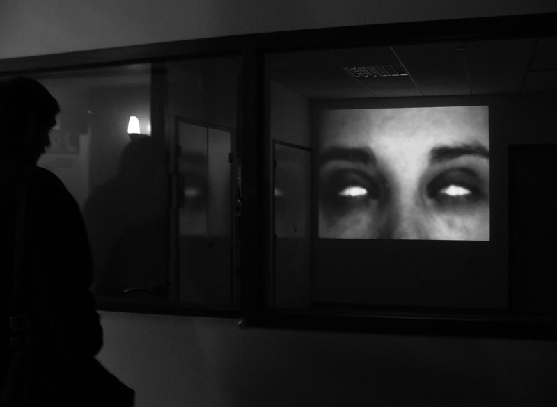 AU COEUR DE... (bis) est une projection vidéographique et sonore qui montre le mouvement convulsif d’une paire d’yeux accompagné d’un son mécanique. Dans l’EHPAD Balay de Saint-Etienne, l’installation disjoint les données visuelles et sonores, plaçant l’image dans une pièce close, visible seulement depuis le sas d’entrée à travers une vitre, et diffusant le son au-dehors, au niveau du rez-de-chaussée du bâtiment. La mise en oeuvre d’un système de détection, en temps réel, de formes et de mouvements instaure une relation entre les corps présents dans le sas avec l’image et le son, tout passage générant l’immobilisation de la première et l’interruption du second. A cet instant précis, s’applique une double surveillance. L’une est signifiée à travers ces deux yeux figés et fixés sur eux. L’autre implique toute autre personne hors du sas, pour qui l’absence de son sert d’indicateur, signe de présence(s) physique(s). Dans AU COEUR DE... (bis), le rôle du spectateur constitue un paramètre d’élaboration, pensé selon une dualité surveillé / surveillant et dans l’idée de sa modification en continu suivant sa circulation dans les différents espaces du lieu d’exposition. Agissant dans les domaines du visible et du sonore, cette pièce confronte, d’autre part, deux mécanismes de surveillance relatifs à l’observation et à la mise en présence électronique du corps, l’un s’avérant être un leurre dans ce regard aveugle, l’autre prenant corps par le silence.