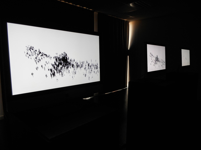 3 vidéos numériques HD, noir&blanc, muettes, 0.15.17. Lecture synchronisée en boucle sur 3 écrans plasma noirs 55''. Edition 1 + 1EA.
