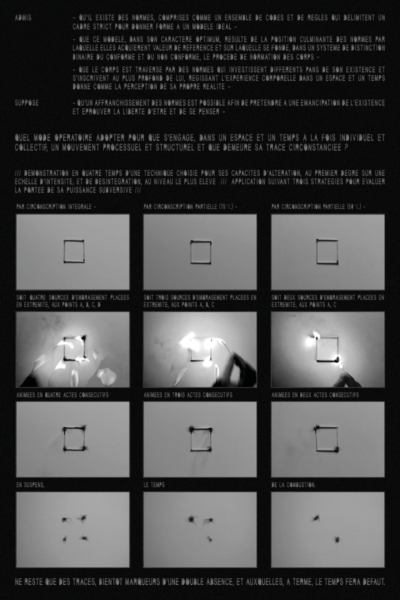 THEOREME est une composition photographique et textuelle qui s'intéresse aux conditions de l'affranchissement des normes d'un point de vue processuel, structurel et temporel. En marge, la question dite du « spectaculaire » et celle, sous-jacente, de l'immédiateté. Les deux composantes de ce travail forment, ensemble, un théorème, avec, d'un côté, une démonstration et, de l'autre, un épilogue. Ce théorème confronte deux types d'actions, à des degrés de « spectaculaire » éloignés, pour tenter d'évaluer leur puissance subversive et son empreinte de cette dernière dans le temps.