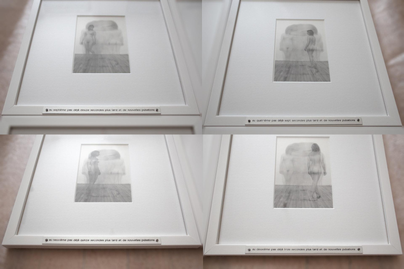 5 photographies numériques, noir&blanc, 9x13cm. Tirage jet d'encre pigmentaire sur platine fibre infinity canson 310g. Sous verre 27x27cm + texte gravé sur plaque de métal. Edition 1.