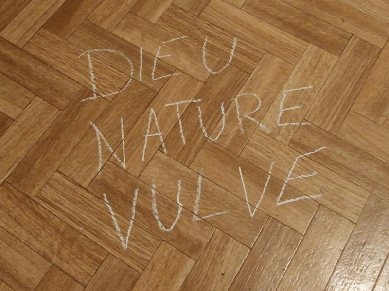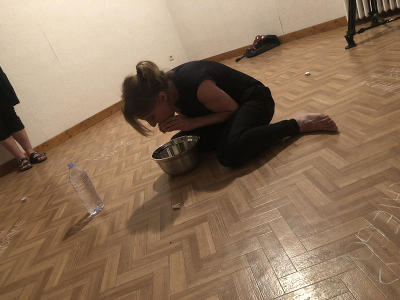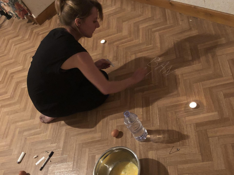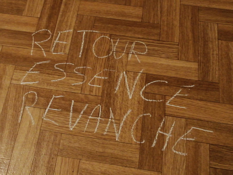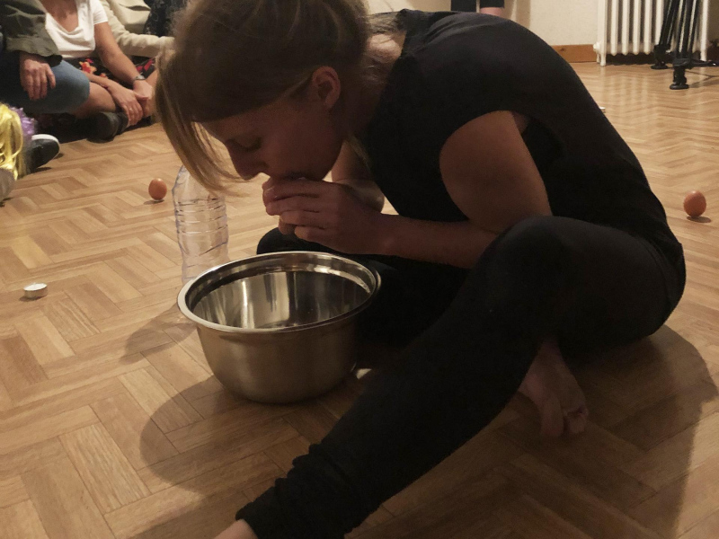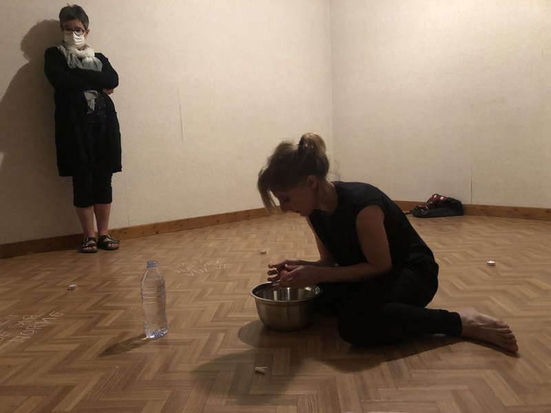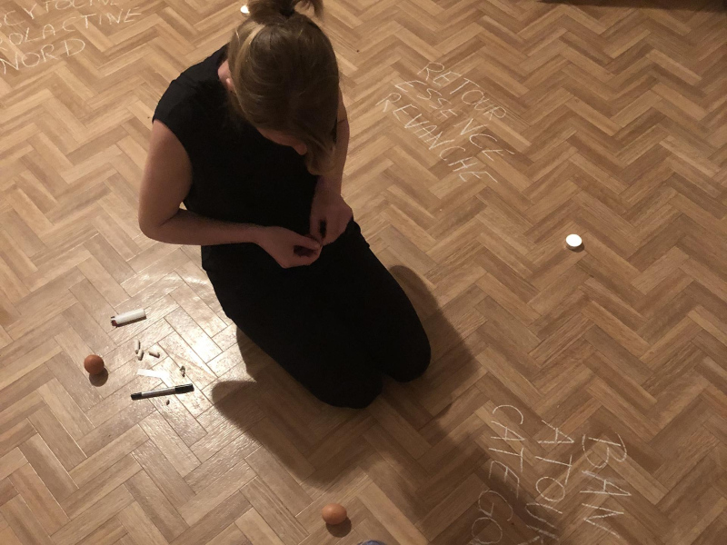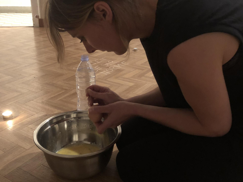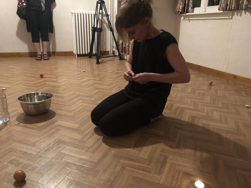 « Seven eggs are placed on the floor and form a circle which defines the space of my performance. With a safety pin, I pierce an egg on two opposite sides. Then I blow inside in order to empty it of all its organic matter, keeping only its shell. I insert a part of my text into the egg, rolling the paper and slipping it inside. I close the two holes of the egg with candle wax. I write three keywords from the text on the floor. I give the egg to someone in the audience. I repeat these movements for each of the seven eggs. The whole text is thus dispersed in the audience, in seven people who have the choice to break the egg to know immediately its content or to take it away and to keep it ».