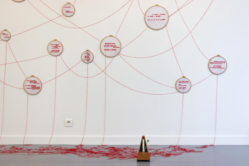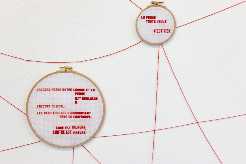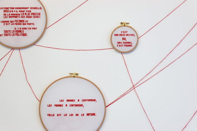 TRANSMISSION-S is an installation that investigates our cultural heritage as for the mode of thought of women, their bodies, their place and their function within society, through speeches and writings from different times and fields, from Sciences and Medicine to Philosophy, from Religion to Media, from Literature to Politics, etc. This installation questions the transmission of this cultural heritage over time and societies, from a processual point of view, when certain elements seem to progressively lose visibility to become latent. It examines the effects of deliberate choices of upholding or concealment of these in the collective consciousness and memory. TRANSMISSION-S results from the meeting with the French writer and feminist Benoîte Groult's works, which reveal the high level of rejection of women and the female body in our history and culture, by ignorance, contempt, hate, condescension, habit and comfort, and which show how all the fields of society center on this rejection, in order to make it solid and permanent. The Benoîte Groult's approach is situated in the transmission of this past as completely as possible, in order to make us realize the mechanisms of the rejection of women and to initiate their deconstruction. TRANSMISSION-S originates from a reversal, that of the recurrent assignment of women to needlework. It proposes a new state of play to extend that of Benoîte Groult, almost fifty years apart.