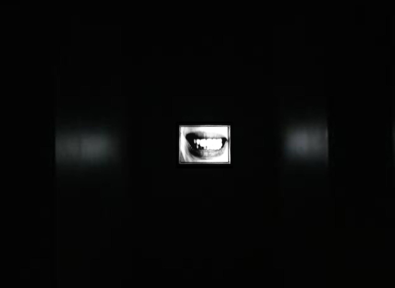 Un couloir sombre et étroit que l'on traverse en son milieu. A l'intérieur, deux vidéos - deux bouches, une succession de sourires crispés - sont placées derrière chacune des deux extrémités du couloir et se font face. Ensemble, ces deux fragments de corps fonctionnent à la manière d'un métronome constant et régulier. Une synchronisation corporelle de 1/1 battant toutes les secondes. Chaque minute, ce tempo se détraque. Il s'accélère brusquement, et, pendant un très court moment, le spectateur, au centre de cet échange corporel, est comme mitraillé, ce qui marque, pour lui, la fin d'un cycle, celui de sa présence dans l'installation.