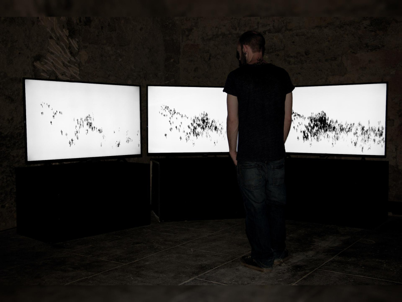 3 vidéos numériques HD, noir&blanc, muettes, 0.15.17. Lecture synchronisée en boucle sur 3 écrans plasma noirs 55''. Edition 1 + 1EA.