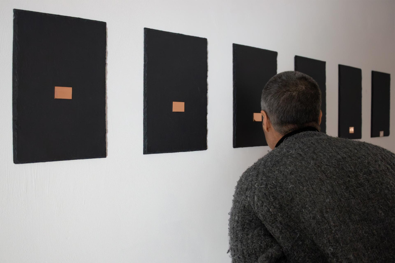 12 ardoises, 20x30cm + 12 plaques de cuivre 2,4x3,6cm + texte. Edition 1.