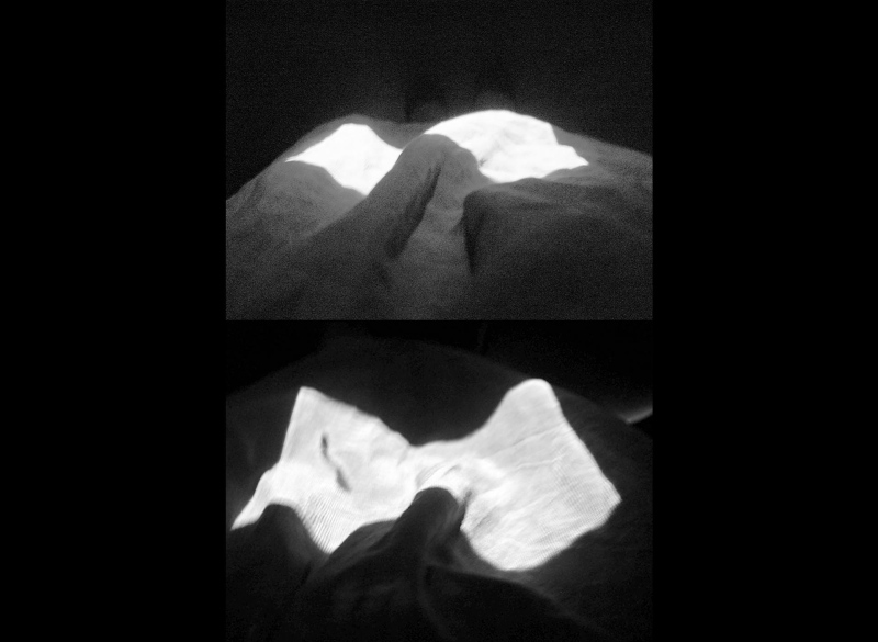 2 vidéos numériques miniDV, noir&blanc, son stéréo, en boucle. 1 projection murale + 1 projection au corps. Espace clos 3,60x3,00x1,80m. Edition 1 + 1EA.