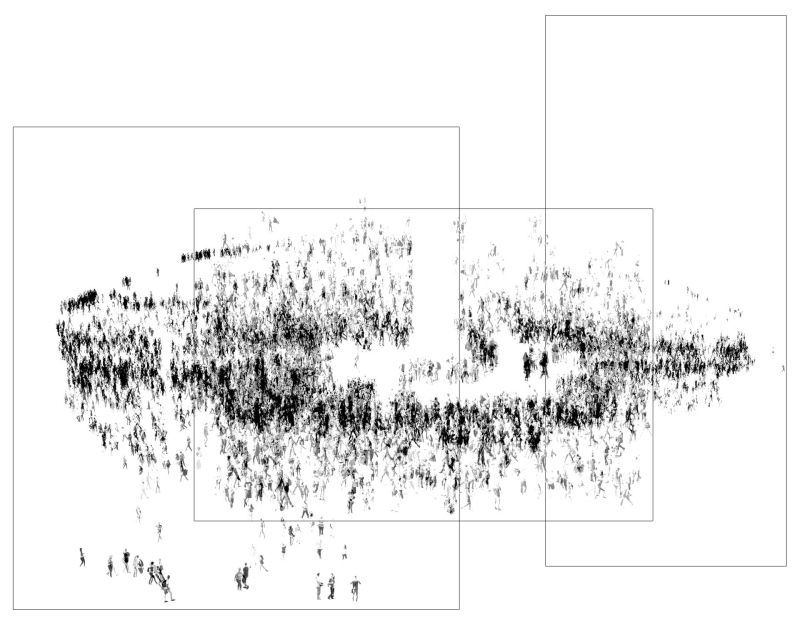 COMPOSINGS (2010/--) est un projet protéiforme d’exploration de l’espace urbain à travers la présence et la mobilité corporelles dans un temps donné. Amorcé en 2010, il est toujours conduit par le même protocole artistique via le médium photographique. Celui-ci associe procédé d’extraction de corps par réfraction de la lumière, quand le soleil est à son zénith et sur des échelles de temps définies par la nature des flux de corps, au procédé d’accumulation de corps par la pluralité des prises de vue jusqu’à la superposition des images. En suivant ce protocole, je compose avec de la coprésence pour (re)construire, à l’image, des espaces, dans un rapport d’inscription/révélation, entendu aussi comme une manipulation de temps. COMPOSINGS est mené dans différentes villes d’Europe et prend, au fil du temps, des formes différentes qui proposent aux spectateurs des modes différents de lecture de l’espace. L’enjeu de ce projet se situe sur un plan politique et social, interrogeant l’agencement contemporain de nos espaces que détermine la recherche d’une fluidité de circulation, résonnant, de par mon point de vue photographique en surélévation, avec celui des dispositifs de vidéosurveillance chargés de capturer le réel par l’image, créant et exploitant des données numériques dans leur fonction de signes. Sur un plan artistique et sensible, ce projet s’ouvre sur la question de nouveaux modes de perception et de compréhension de l’espace dans sa représentation.