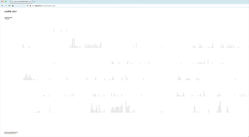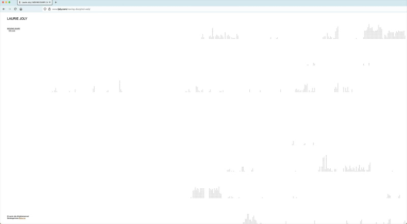 MOVING DIARY est une page web qui, à la manière d’un journal de bord, retrace mon activité virtuelle sur le réseau internet pendant le mois de mai 2013. Celle-ci résulte d’une mémorisation informatique, mise en oeuvre par mon navigateur internet et conservée de mon côté dans un rapport quotidien et mensuel, de données relatives à mes consultations de sites web puis de leur traduction graphique, suivant des règles esthétiques et temporelles. La lecture s’effectue chronologiquement de gauche à droite, pour le fil d’une journée, et de haut en bas, pour celui d’un mois. Dans une opposition de couleurs, ses composantes graphiques participent, ensemble, à une densimétrie.