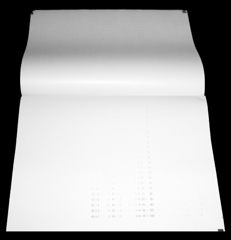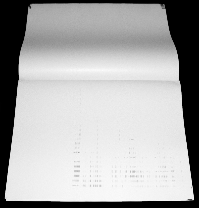MOVING DIARY : ONE MONTH OF VIRTUAL MOBILITY est un journal imprimé qui propose de (re)découvrir le taux de ma co-présence à travers une nouvelle mise en forme des données constitutives du projet initial, déterminée par le format du support. Chaque page correspond à une journée du mois de mai 2013 et se parcourt, chronologiquement, de gauche à droite. Ce changement d’aspect, inhérent au nouveau support, tend à suggérer la pluralité de manipulations dont peut faire l’objet toute donnée numérique et son influence du côté du déchiffrement et de l’interprétation.