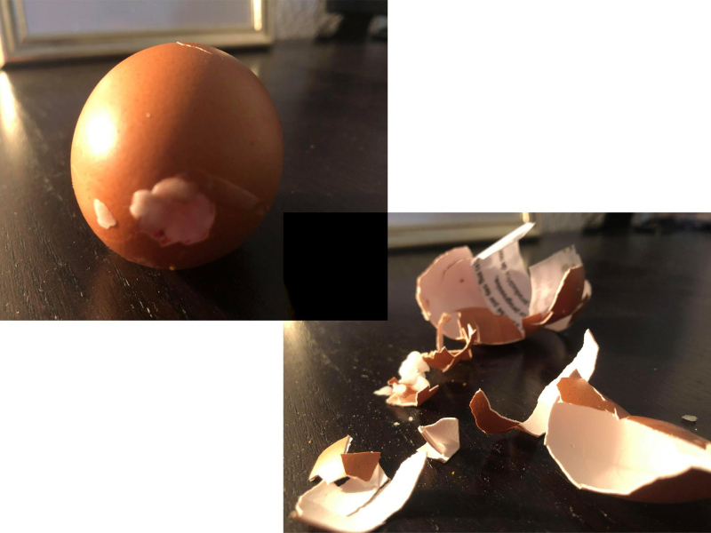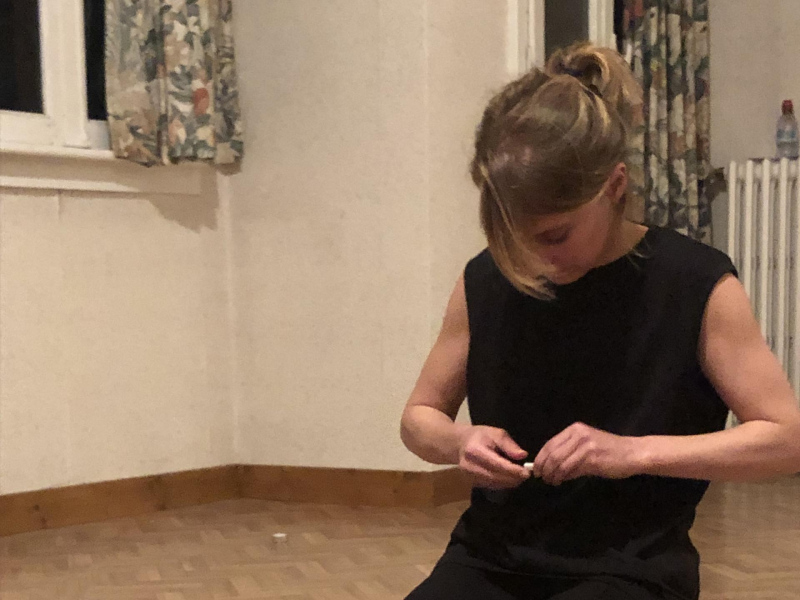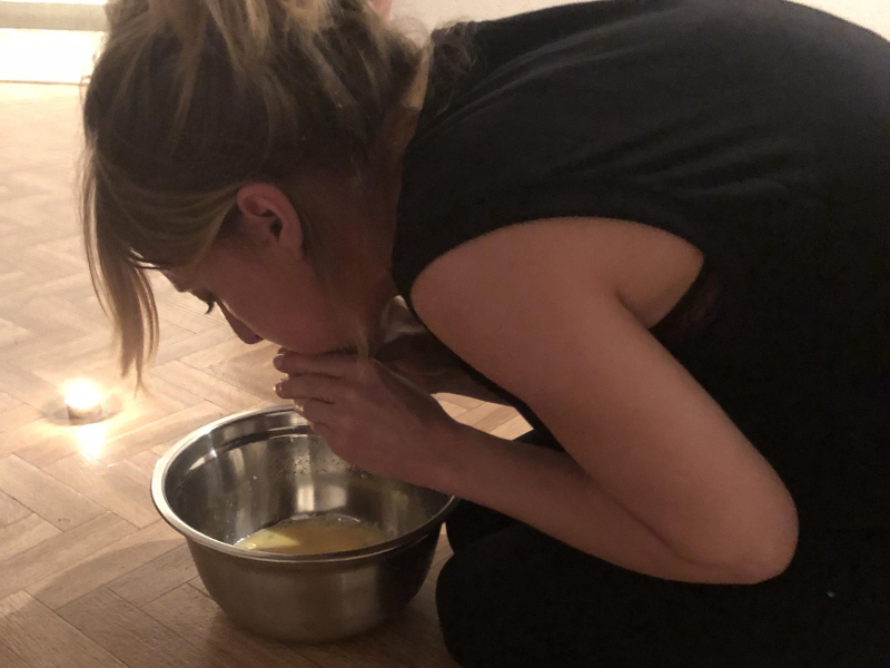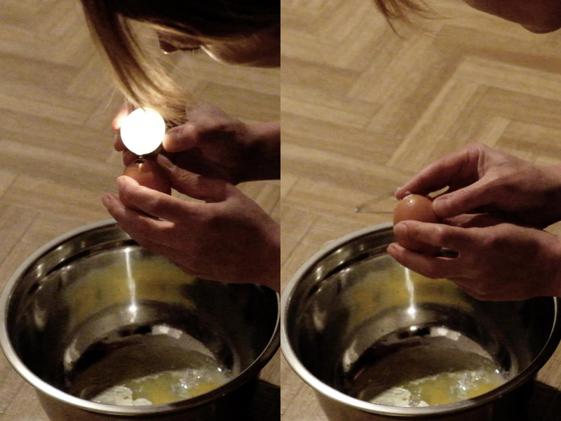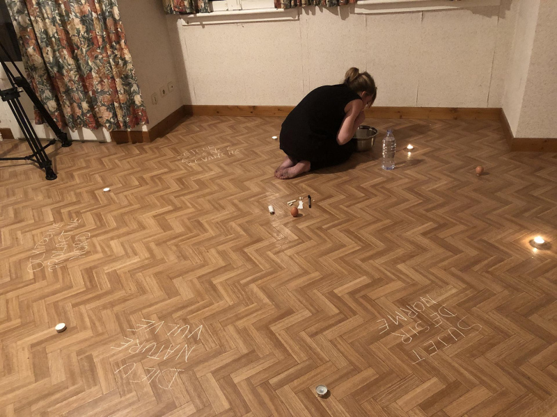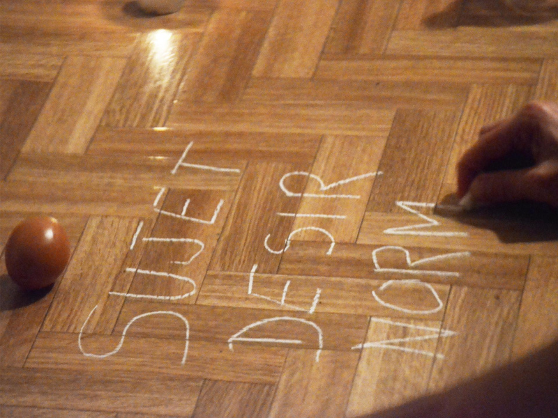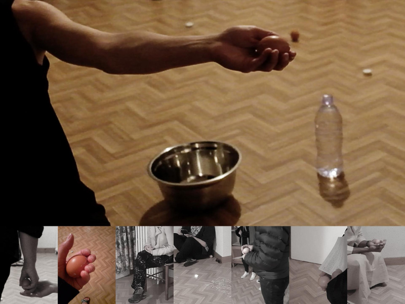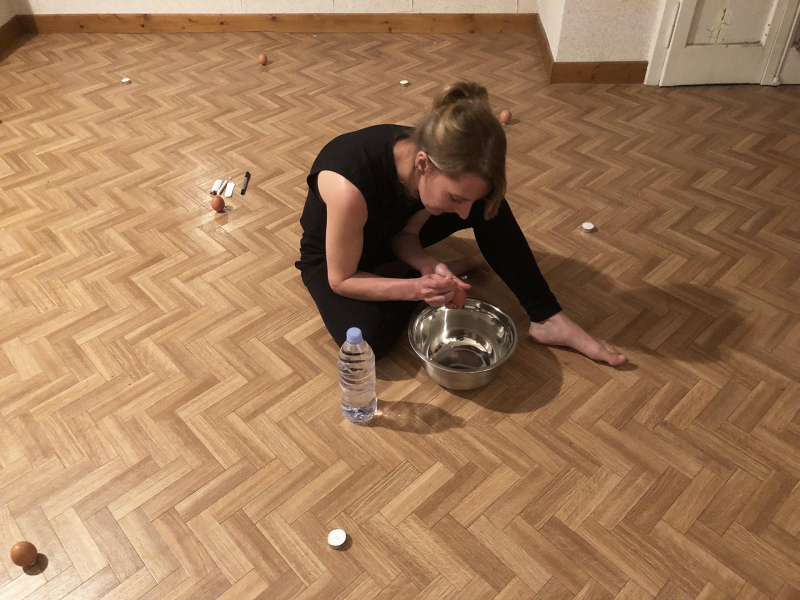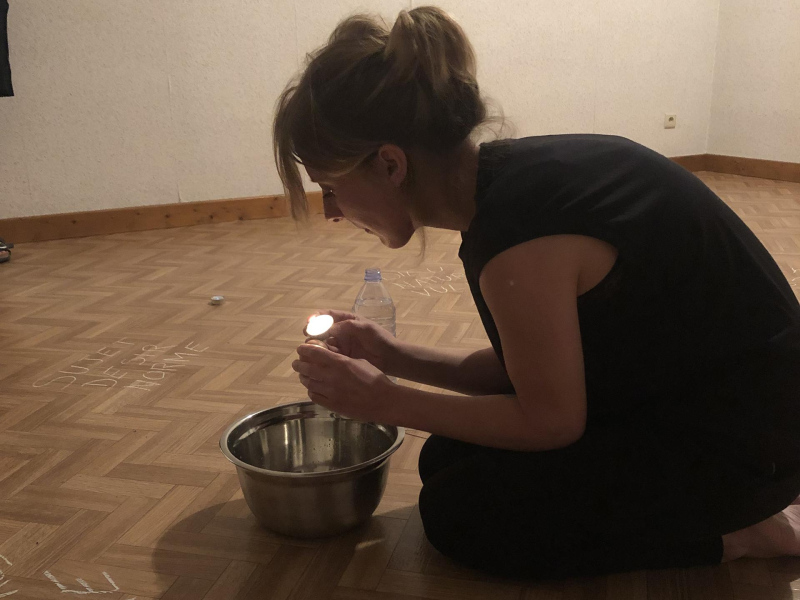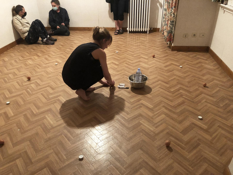 « Seven eggs are placed on the floor and form a circle which defines the space of my performance. With a safety pin, I pierce an egg on two opposite sides. Then I blow inside in order to empty it of all its organic matter, keeping only its shell. I insert a part of my text into the egg, rolling the paper and slipping it inside. I close the two holes of the egg with candle wax. I write three keywords from the text on the floor. I give the egg to someone in the audience. I repeat these movements for each of the seven eggs. The whole text is thus dispersed in the audience, in seven people who have the choice to break the egg to know immediately its content or to take it away and to keep it ».