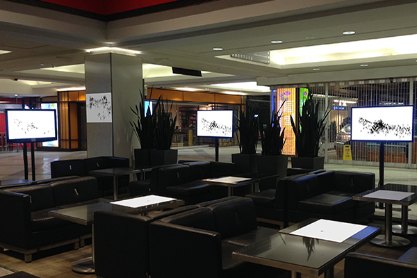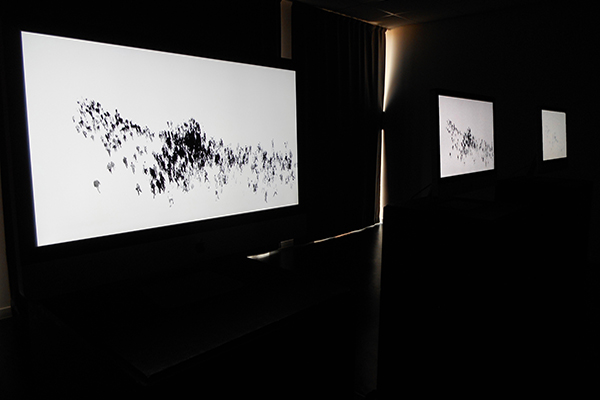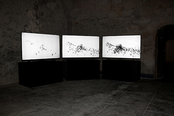 3 vidéos numériques HD, noir&blanc, muette, 0.15.17 / lecture synchronisée en boucle sur 3 écrans plasma noirs 55''