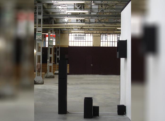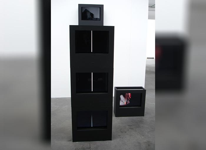 2 miniDV digital videos, color and blanck&white, mono sound, loop + 1 digital video, black&white, stereo sound, loop. Broadcast on 5 monitors in 5 black boxes + ampli/speakers. Edition 1 + 1EA.