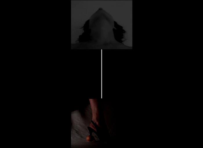 Deconstruction/Reconstruction of a body. Body parts, rebuilt as a musical staff. A group of interacting fragments. In the middle, a line crosses three screens, it is the link between the two extremities of the body. On the top, a head swings from one side of the screen to another, it gives the tempo to the installation. Its movements guide the line on the screens. When the head disappears from the screen the line glows producing an irritating sound. When the head is in the center of the screen the movement of the line stops and a high heel shoe appears on the fifth screen placed on the floor. The high heel breaks an egg, emitting a sharp sound before the image vanishes.