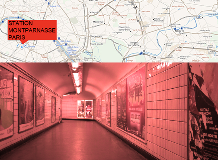 Walking performance : Montparnasse-Bienvenüe tubr station, Paris, France, 1.30.00 / Stereo sound broadcast : IFI building, Paris-Est University, Noisy-le-Grand, France, 1.30.00. Equipment : GSM spy-micro + Samsung F480Player mobile + ampli/speakers.