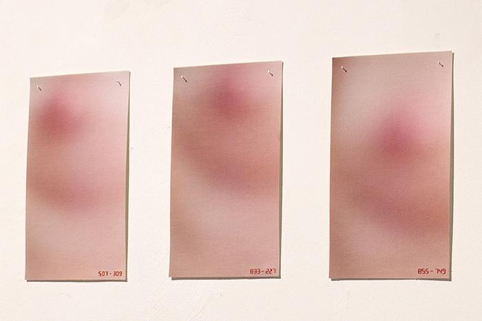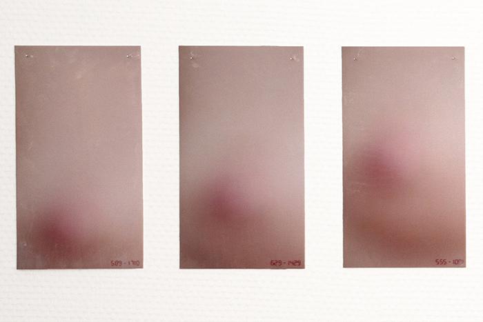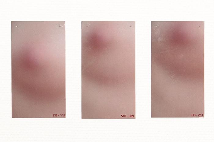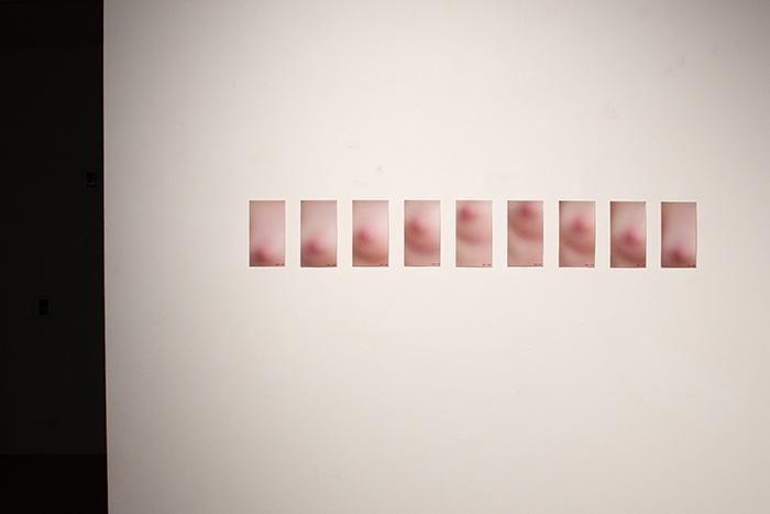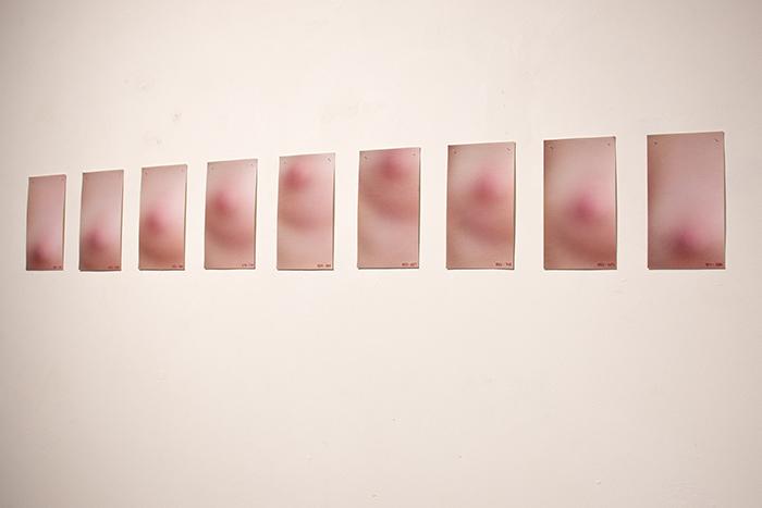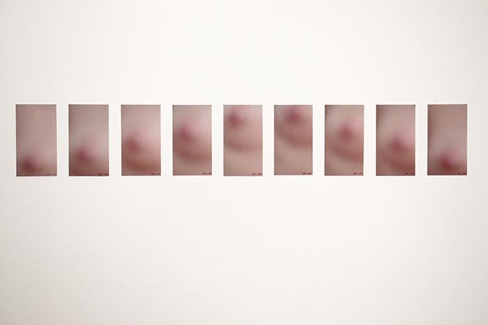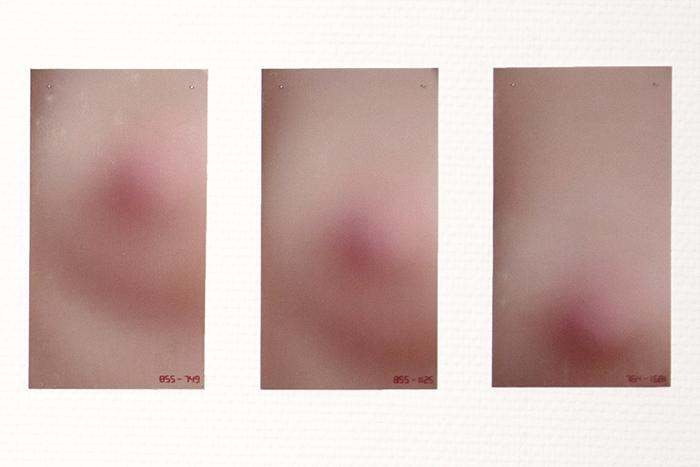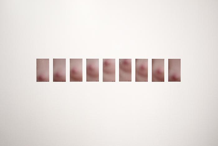 OBSESSION is a photographic series which breaks down a breathing movement and focuses eyes on a woman's breast, following her nipple closely. The starting point of this work is in the political and social projections on this part of the women body, sexualised, eroticised or reduced to its nourishing function, and which, at the same time, must be hidden, with clothes in the real word, by blurring techniques in the virtual world of the images and internet. OBSESSION questions this gendered symbolic charge by playing with the blurring and the focus that the spectator has to do continuously, if he wants to perceive the image and the movement thus decomposed, or to read the small sewn numbers which locate the nipple in the image frame.