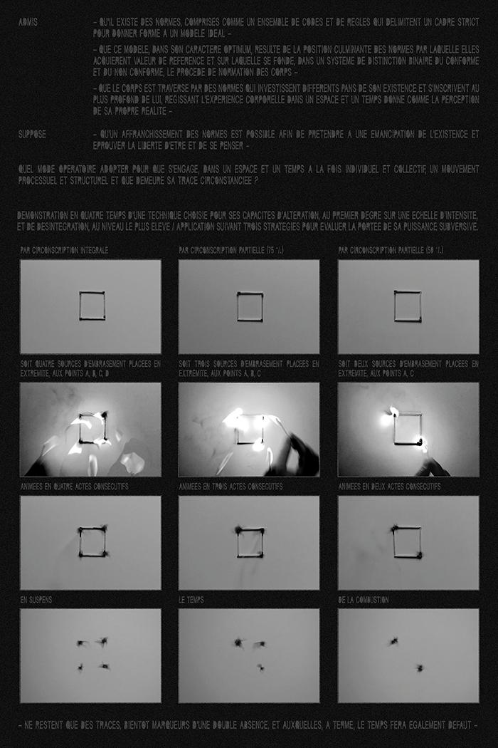 THEOREME is a photographic and textual composition which explores the conditions to get away from norms, from a processual, structural and temporal point of view. At the margin are the questions of « spectacular » and the one underlying of immediacy. Together, the two parts of this work give form to a theoreme, with a demonstration on the one hand and an epilogue on the other. This theoreme compares two types of actions, to distant degrees of « spectacular », in an attempt to estimate their subversive power and its mark in time.