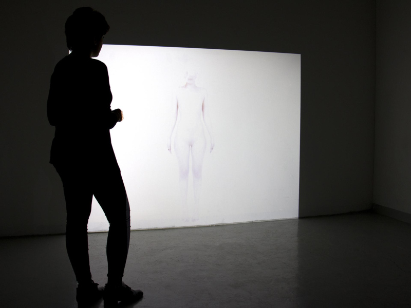 NONAME shows a naked body whose flesh has been purified, digitally homogenized. In a slow, continuous and repetitive movement, this body appears and then fades away ; only a few gendered external attributes remain visible. This new corporeal appearance and the temporality and movement of the image allude to the evanescence of corporeal identity.