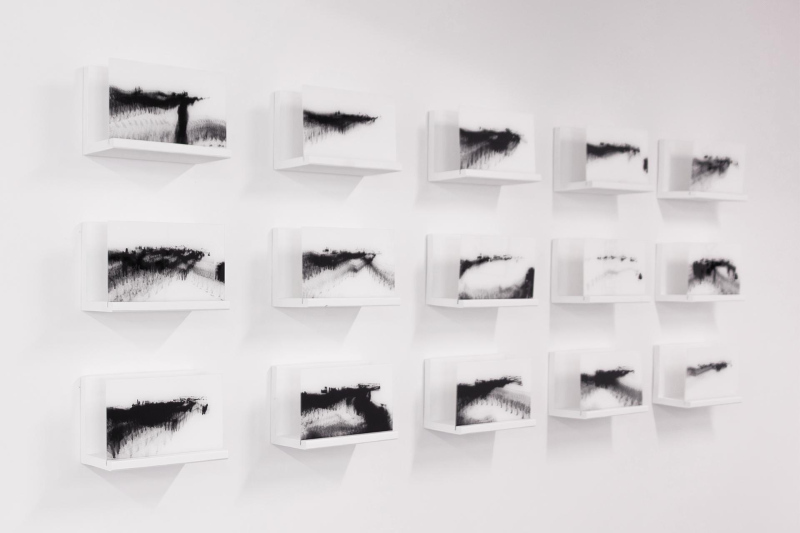 15 digital photographs, black&white, 18x32cm. Acrylic print on transparent acrylic glass diasec. Mounted on white wooden structure. Edition 1 + 1EA.