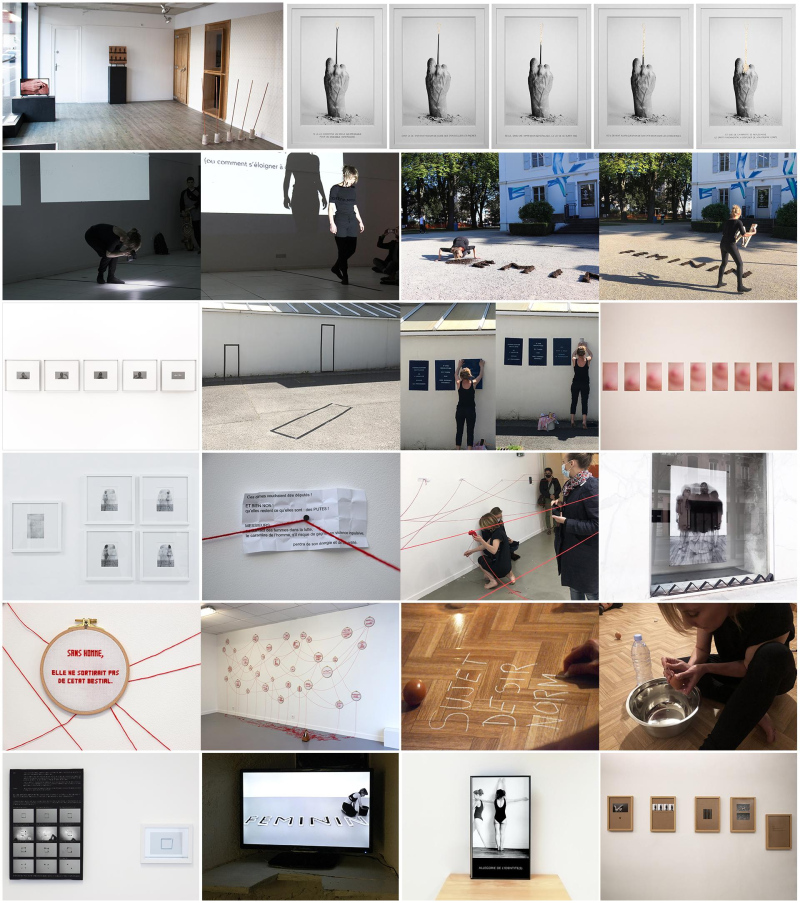 from 2017 - « My current work questions Gender in its identity assignment and the modes of transmission of its norms in History and Culture. The normative and standardized production of a social identity according to biological sex brings me, on the one hand, to speak of an identity « on feminine » and an identity « on masculine », in order to associate the process of production with the issue of conformity, and thus to accentuate the political dimension in the construction of Identity. On the other hand, it focuses my art practice on the question of deviation which enables to take distance from norms and creates other possibilities. The deviation takes shape in space through gesture, movement of body. I especially use Photography, Video and Performance, in which I incorporate text. These texts can be based on essays, notions and expressions. They have both artistic and theoretical characteristics and they intervene as an integral part of my work, sometimes becoming an image. Together, Body in Action and Text interact to reveal frameworks and their limits, and to question the possibilities of detachment ».