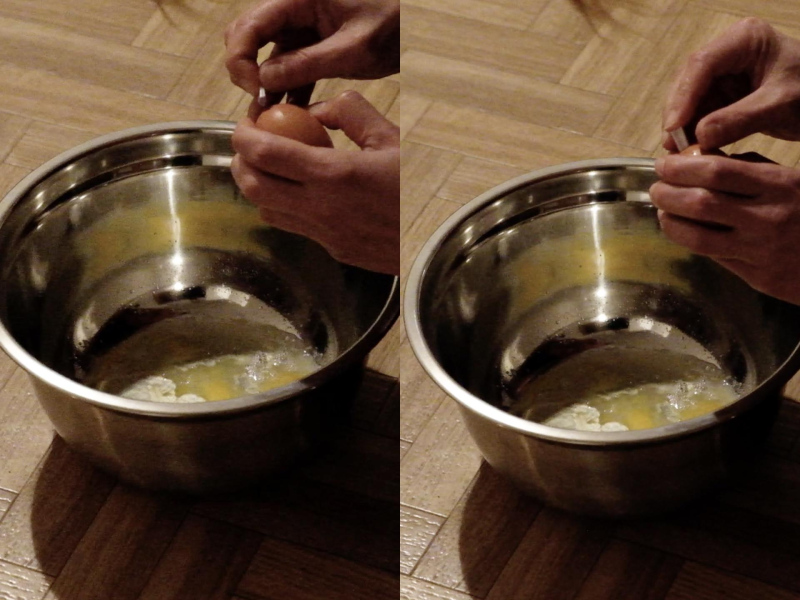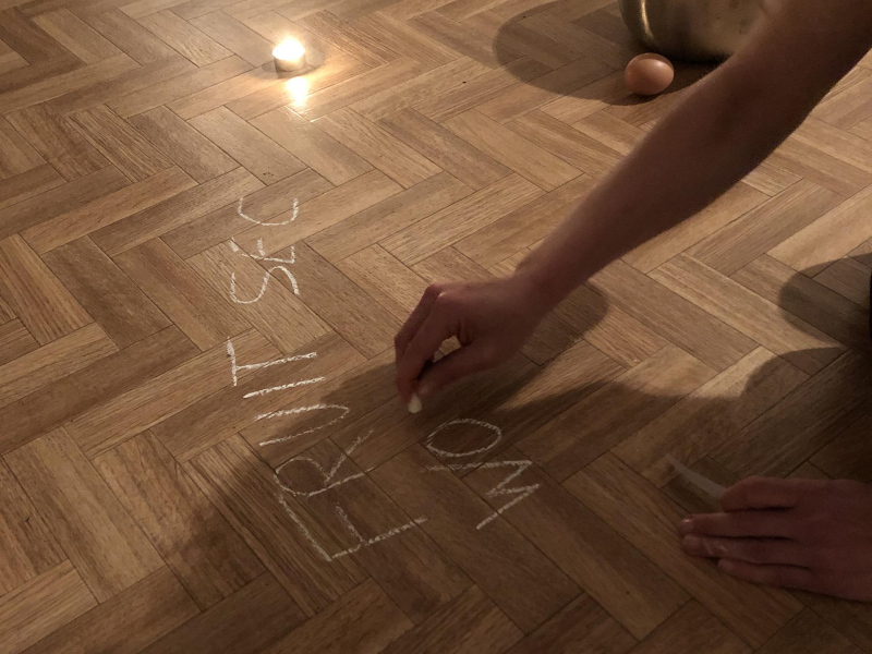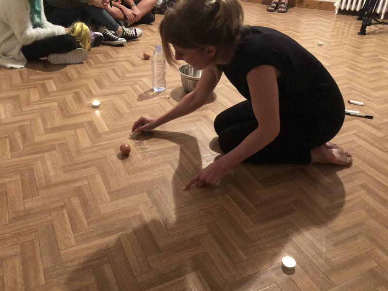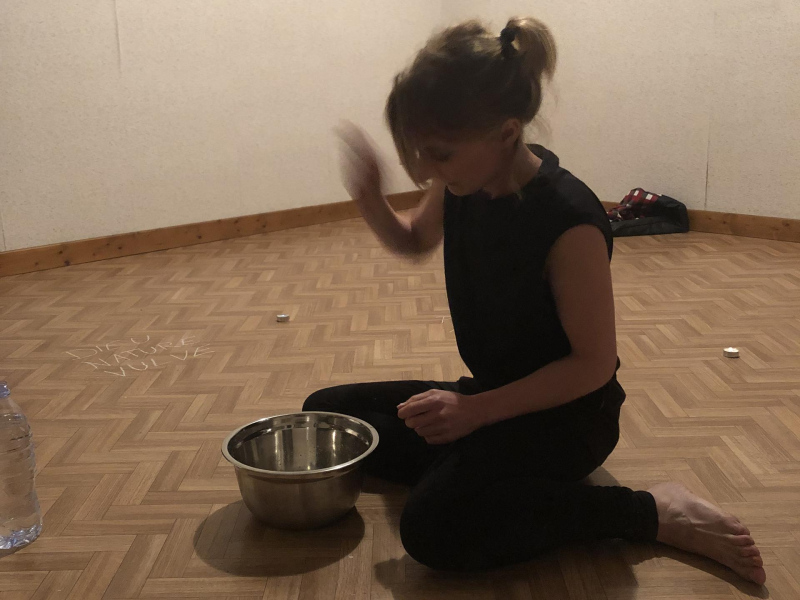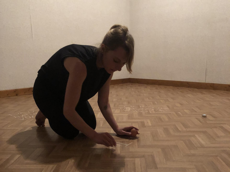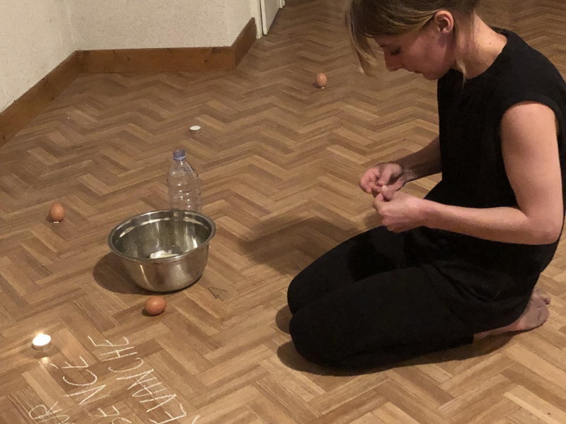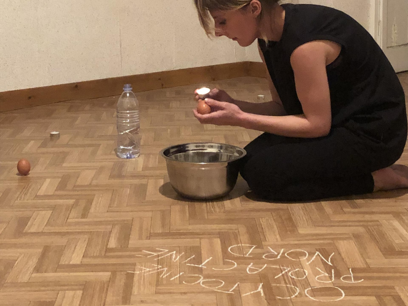 « Seven eggs are placed on the floor and form a circle which defines the space of my performance. With a safety pin, I pierce an egg on two opposite sides. Then I blow inside in order to empty it of all its organic matter, keeping only its shell. I insert a part of my text into the egg, rolling the paper and slipping it inside. I close the two holes of the egg with candle wax. I write three keywords from the text on the floor. I give the egg to someone in the audience. I repeat these movements for each of the seven eggs. The whole text is thus dispersed in the audience, in seven people who have the choice to break the egg to know immediately its content or to take it away and to keep it ».