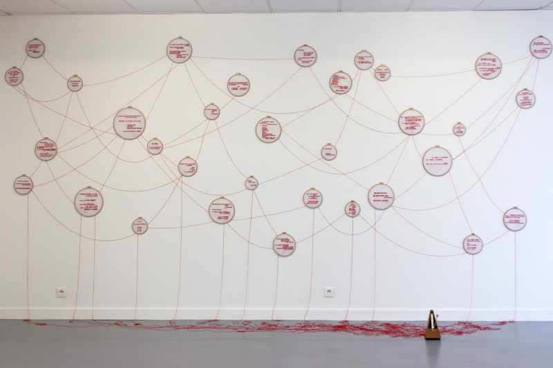 33 embroidery frames (various sizes) + 666 red thread + 1 broken wooden metronome + stereo sound. Edition 1.